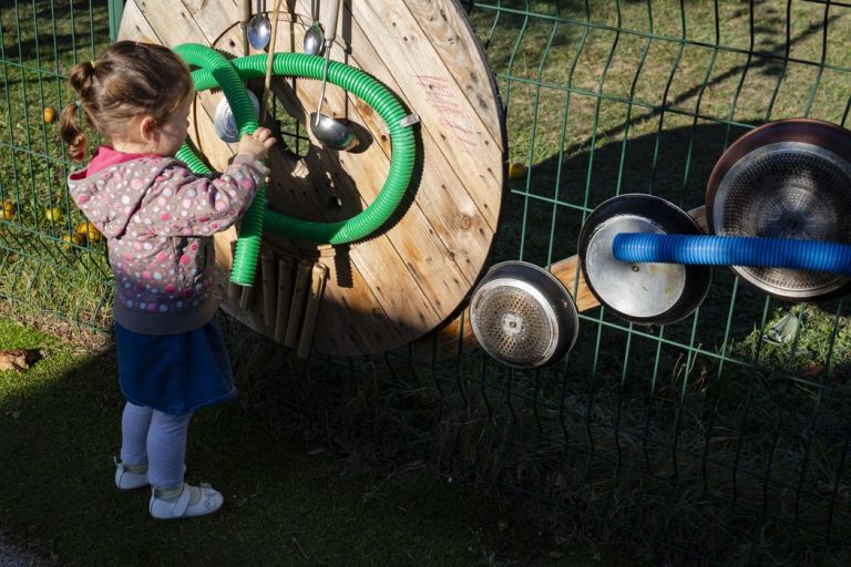 La place de la nature et du jouer dehors, sont des axes fort du projet de la structure. Donnant sur le jardin public de la commune, le jardin de la crèche est doté de pommiers, d’un pin, d’herbes aromatiques, et d’un espace potager qui verra le jour en 2026, offrant ainsi un espace riche à l’exploration et au développement des enfants au fil des saisons. Afin de développer le potentiel de ses espaces extérieurs, et de diversifier ses propositions, l’équipe des Bidibulles, en partenariat avec les familles, a créé de nouveaux espaces de jeu (panneaux d’activités sur les grillages, mur de transvasement) et investi dans de nouvelles structures de motricité créées, sur mesure, en partenariat avec l’ONF. Une pergola et du mobilier d’extérieur ont été renouvelé pour apporter aussi plus de confort.